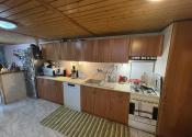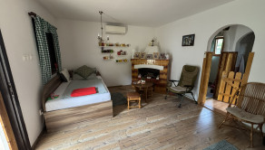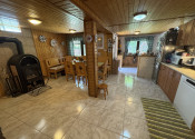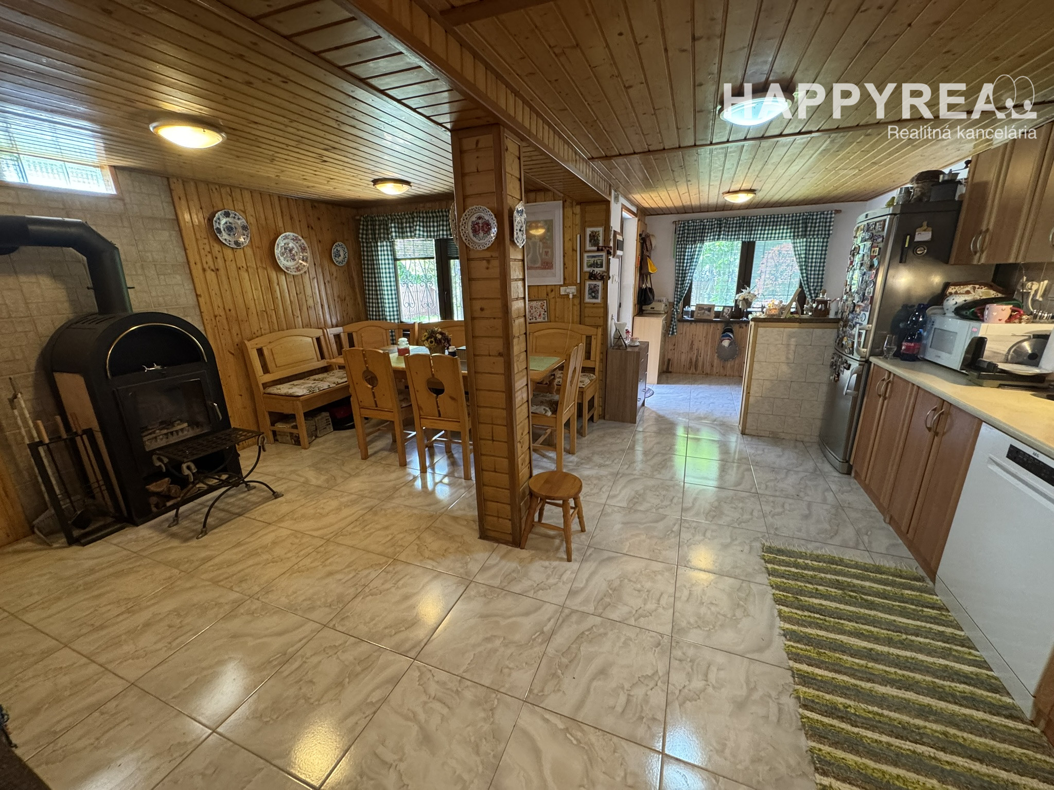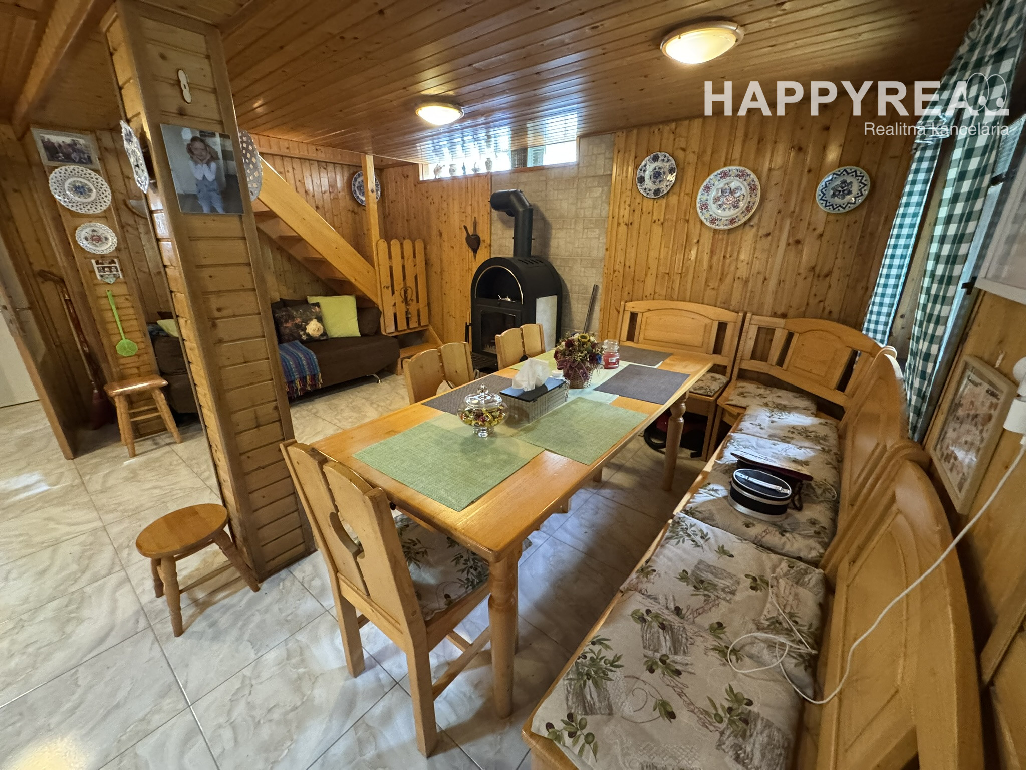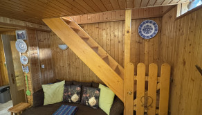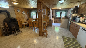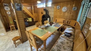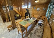 Prízemie: priestranná spoločenská miestnosť s kuchynským kútom, krbové kachle, jedálenský kút a WC